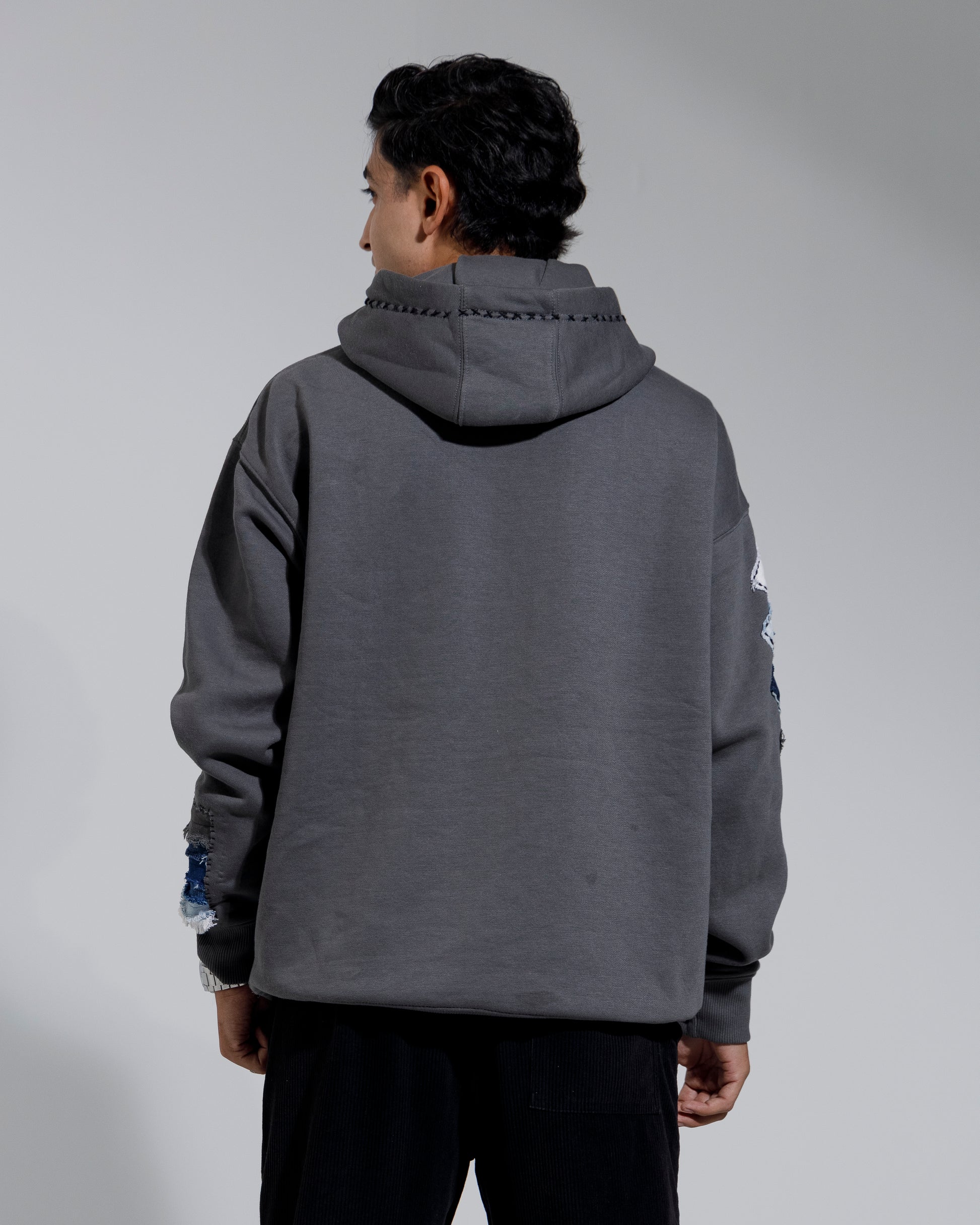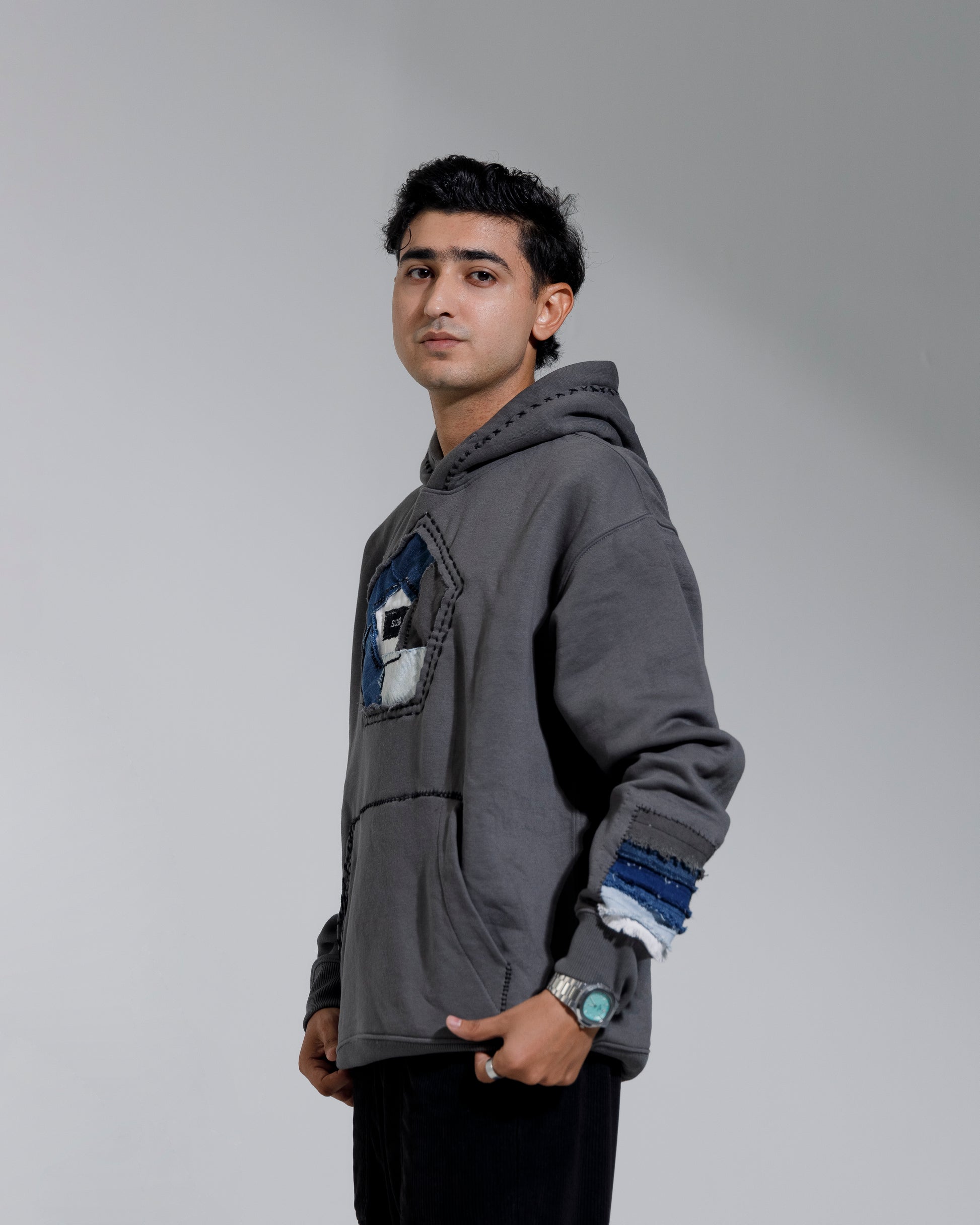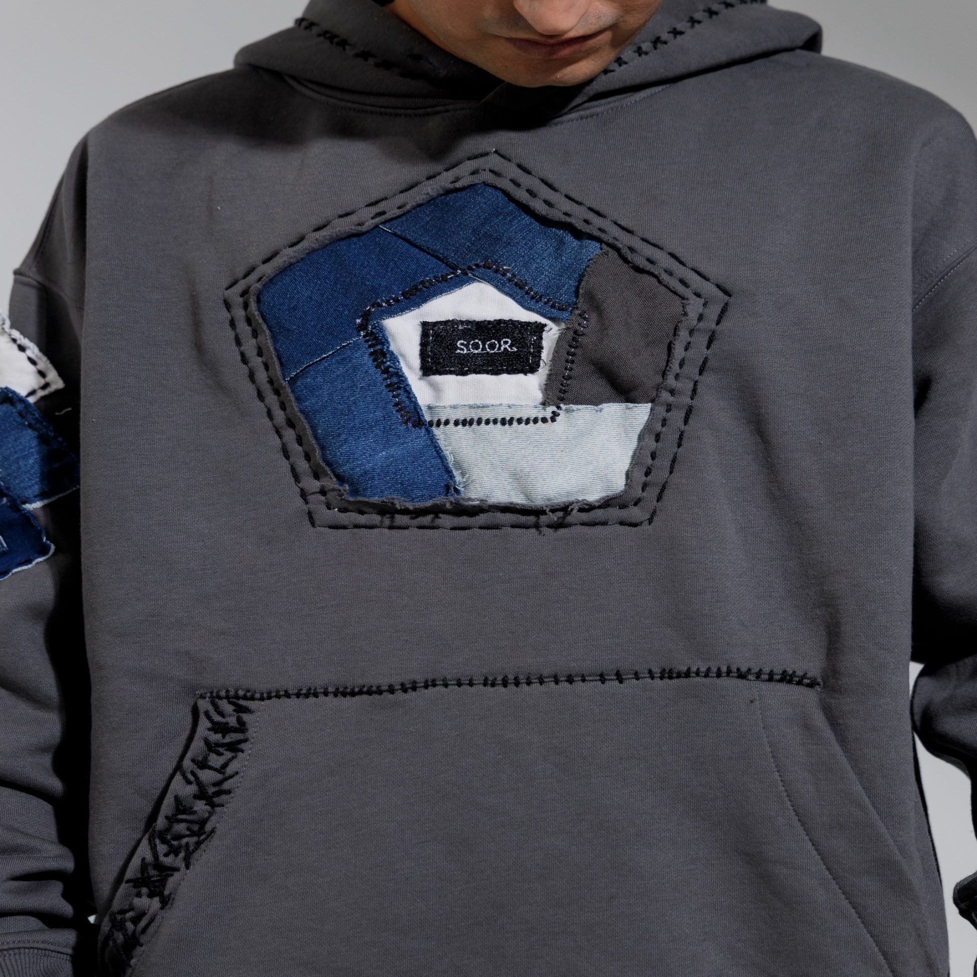 The Design Detail: The centerpiece is a hand-assembled pentagonal patchwork on the chest, utilizing various washes of premium indigo and white denim. This geometric "shield" is secured with aggressive, thick-gauge black overlock stitching, a theme that continues along the kangaroo pocket and hood. We’ve added stacked denim "status" patches on the sleeves, mimicking the look of industrial rank or utility bands, providing a rugged, asymmetric visual that looks incredible from every angle.