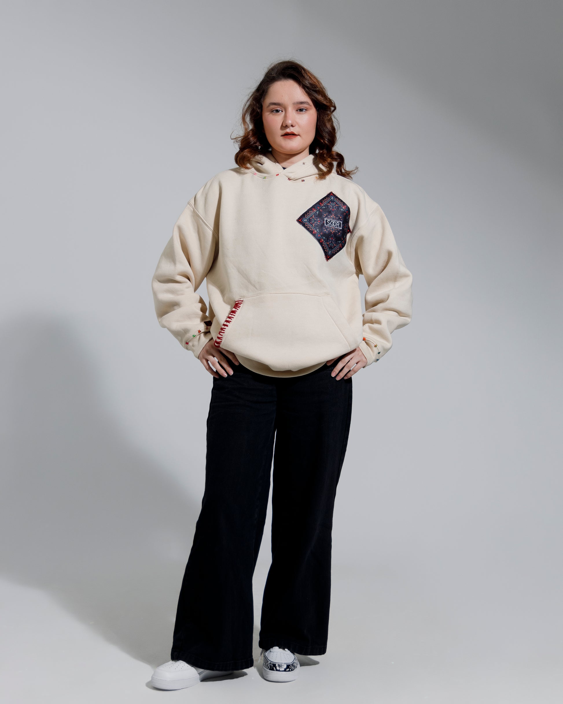The Design Detail: The true power of this hoodie is in the tactile contrast. The chest and back are anchored by diamond-set bandana patches in a deep midnight and crimson palette, secured with signature, aggressive overlock stitching in a bold blood-red thread. We’ve added hand-finished red "X" stitches along the pocket opening and the hood edge, a detail that emphasizes the raw, artisanal construction that defines the SCOR brand.
