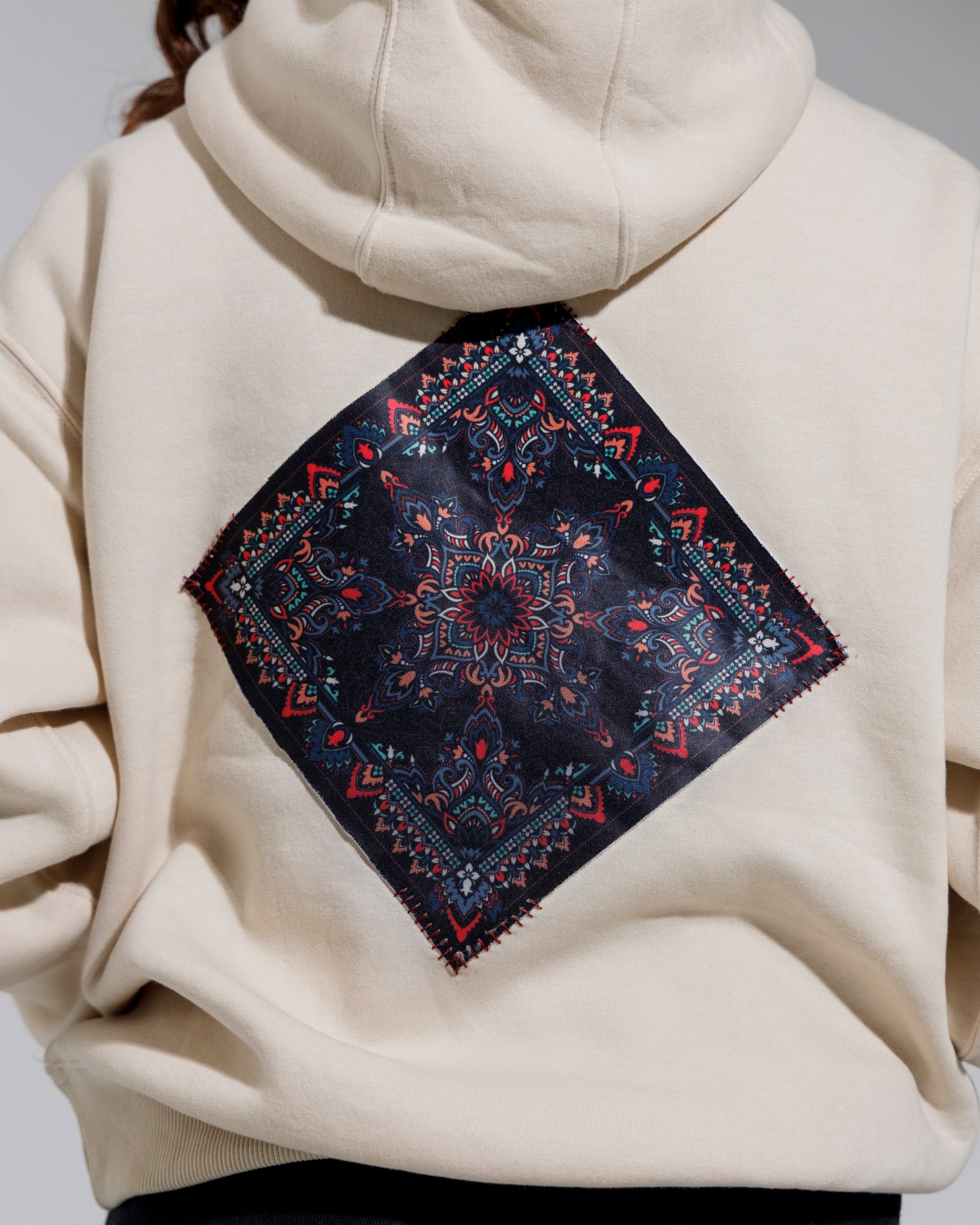 The Heirloom Bandana Patchwork Hoodie is a masterclass in the "Handmade Luxury" aesthetic of Winter 2025. We’ve taken a heavy, creme-colored fleece—reminiscent of traditional winter wools—and disrupted it with rich, jewel-toned bandana patchwork. This is for the curator who wants a piece that feels like a family heirloom, reimagined for the high-end streetwear market.
